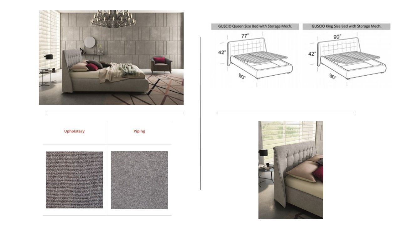 The Guscio Queen Premium Storage Platform Bed combines modern design with smart, space-saving functionality. Upholstered for a soft, refined look, the Guscio bed adds both comfort and visual warmth to contemporary and transitional bedrooms.