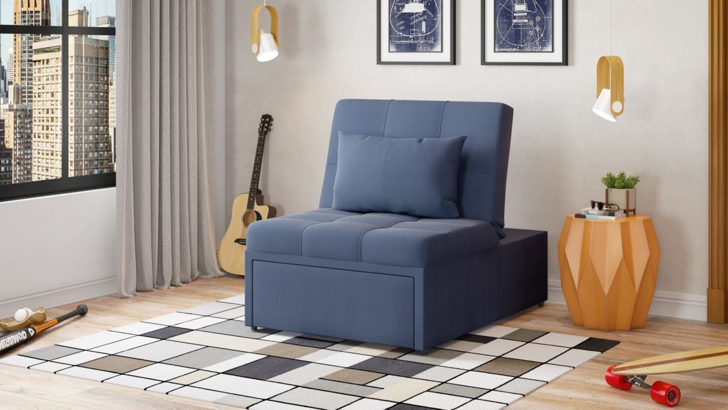 Single Sleepers & Pull Outs, In A Box Products. Relax and unwind your way with the ever chic and always accommodating Mello Pull Out Chair. This bubbly convertible chair features a contemporary profile with a boxy base, aesthetically pleasing angles, and bubbly button tufting. Made for mellowing out, this oversized seat sits atop a pull out base that houses a cozy sleeper mattress, transforming any space into an instant guest bedroom by effortlessly pulling the bed out from its secret compartment. Kicking back is encouraged with an adjustable reclining back that knows all the right angles for optimized movie night viewing or curling up with a good book. With conveniently space-savvy features, an array of attractive color options to choose from, and style that’s as trendy as it is versatile, you’ll be tempted to get one for every room.