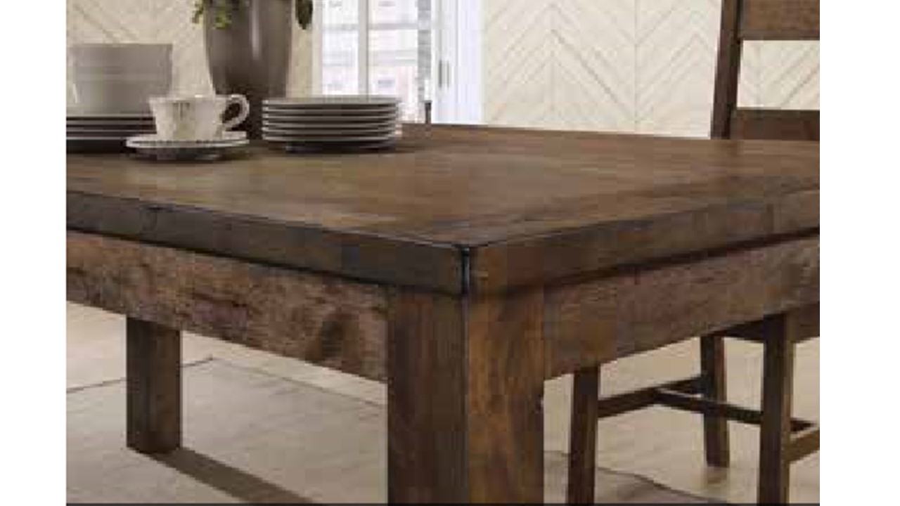 A dining set made with solid hardwood with plenty of knots and organic wood grains. The natural characteristics in solid wood allow each table and chair to be unique with its own charm. Wood surface is textured for a great rustic feel. Chair has seat frame construction. Solid wood at a great value