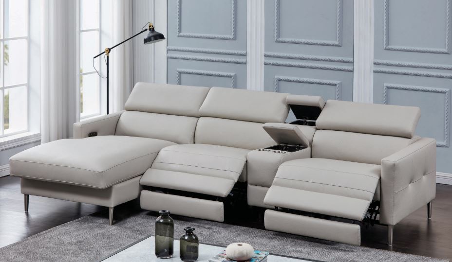 Four-piece modular power motion sectional upholstered in light grey pearlescent breathable performance polyurethane