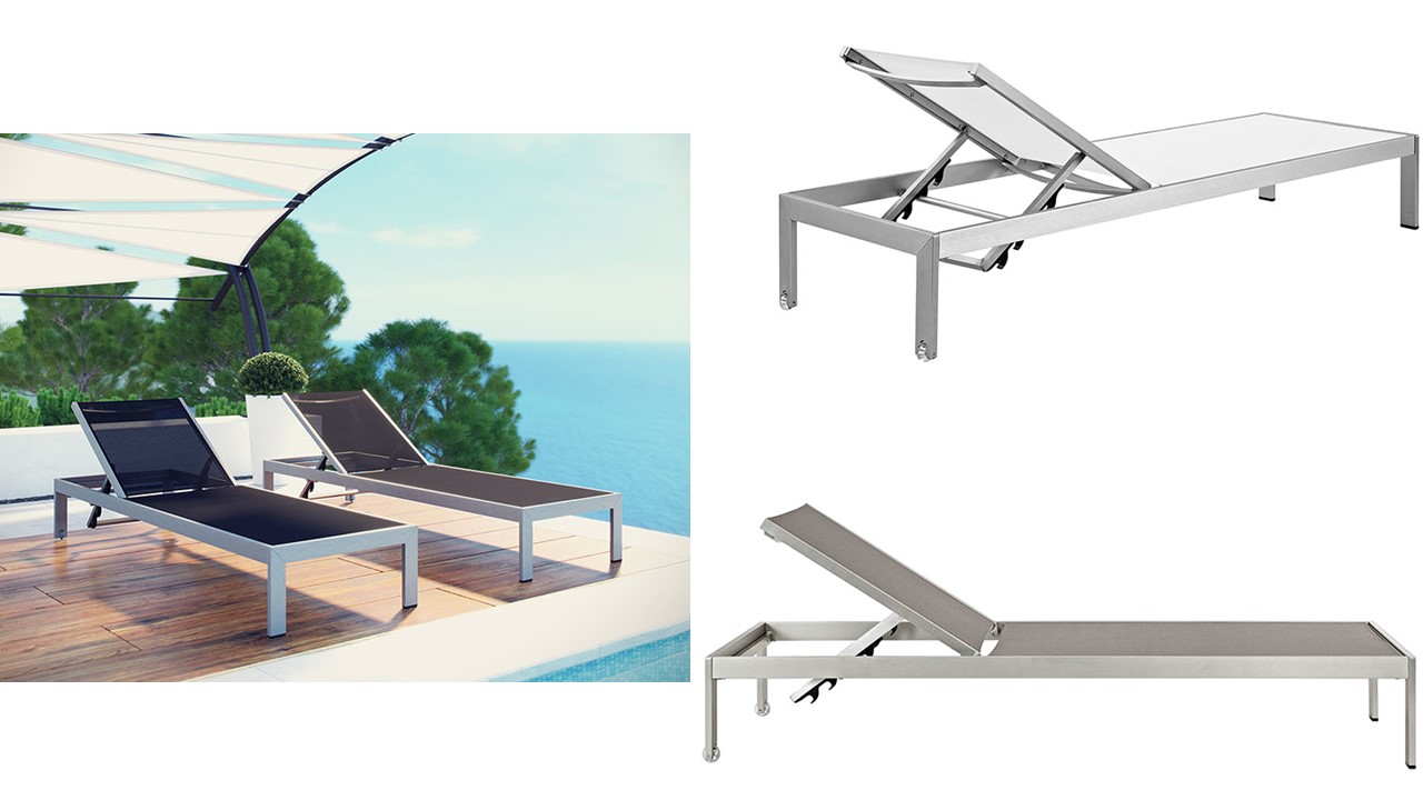 Maintain clean lines with the Shore Outdoor Sun Lounger in Mesh. Strong and durable, relax as you choose from four available recline positions or sunbathe while lying flush on Shore’s breathable Textilene® mesh. Made with an anodized brushed aluminum frame, Shore is a breeze to assemble, comes with clear wheels for easy mobility on the top end, and non-marking black plastic foot caps under the bottom two support legs. Chic and minimalist, the Shore Outdoor Sun Lounger in Mesh is a piece built to last with the comfort and versatility you’ve been looking for in an outdoor lounger.