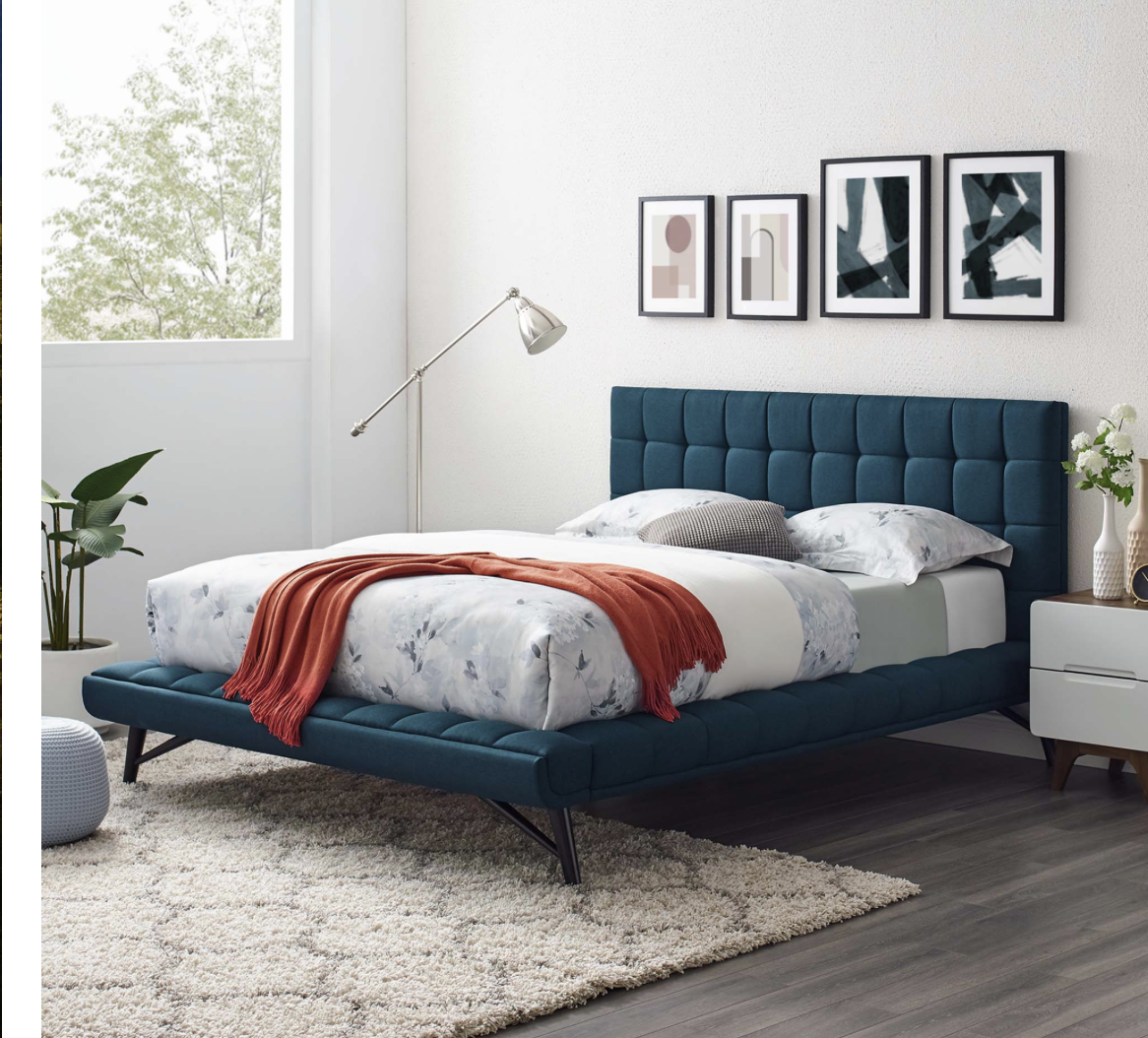 The Julia Queen Platform Bed brings soft, elegant style to your bedroom with its tufted upholstered design and clean, modern lines. The detailed headboard adds texture and visual interest, making it a standout piece while still maintaining a refined, balanced look.